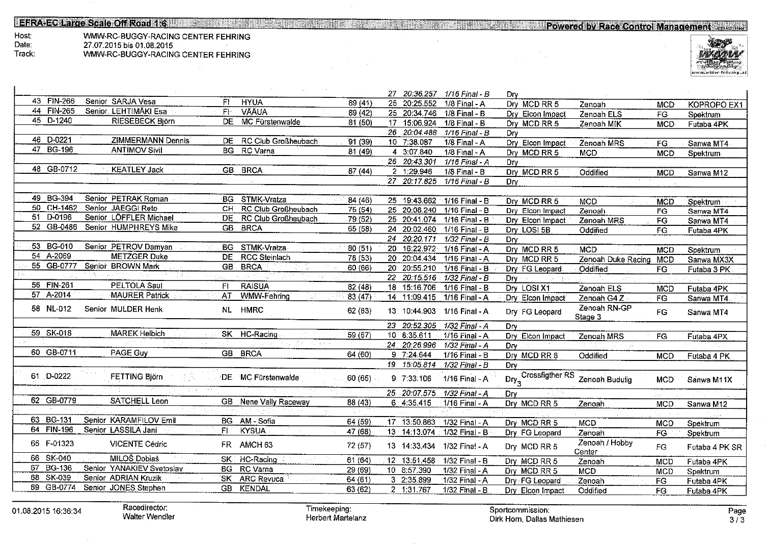 The qualifications and lower finals started on Friday and on Saturday the semi finals were made. The fierce competition left some of MCD's favorite drivers out of the final such as Marc Kreisig, Steve Haynes, Ozgur Derin, Valentin Peuzat, Alain Sarafyan and Dirk Kellermann. Even so 7 cars out of 10 were MCD RR5 at the finals.