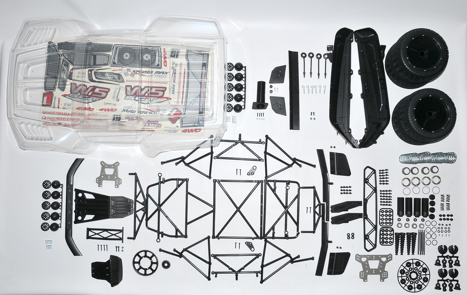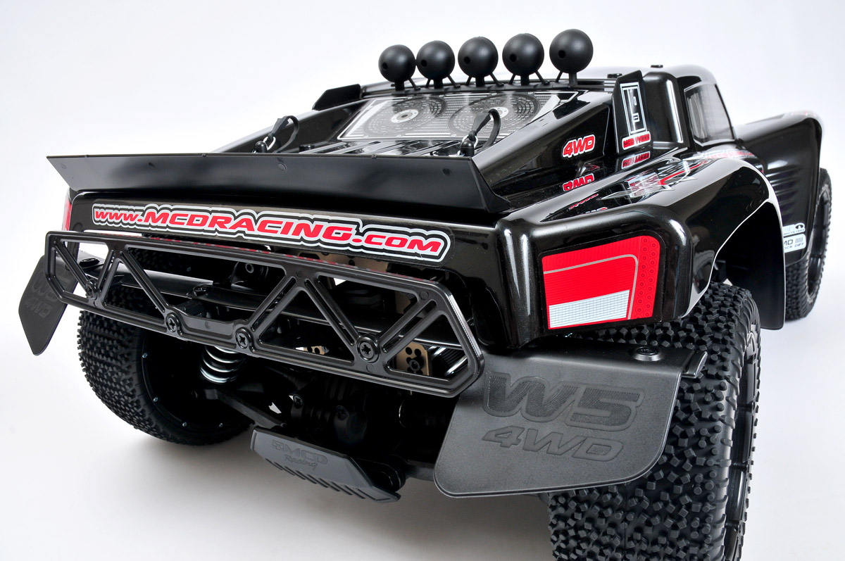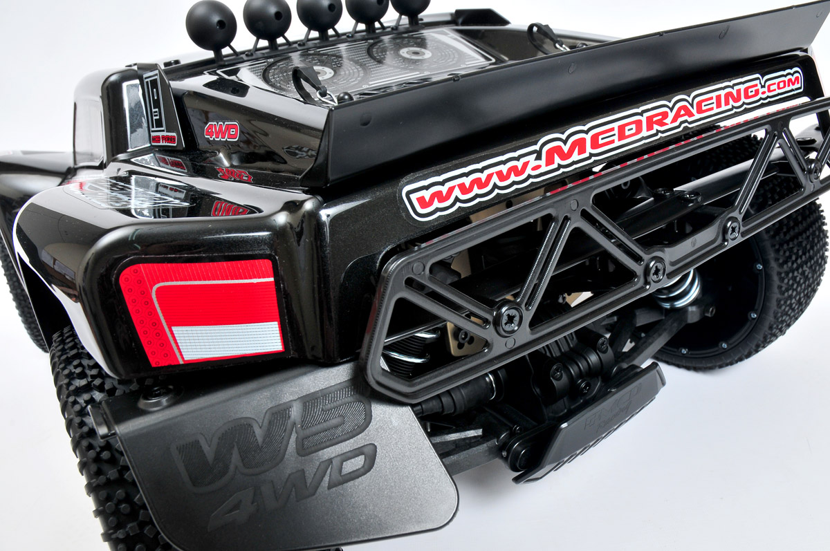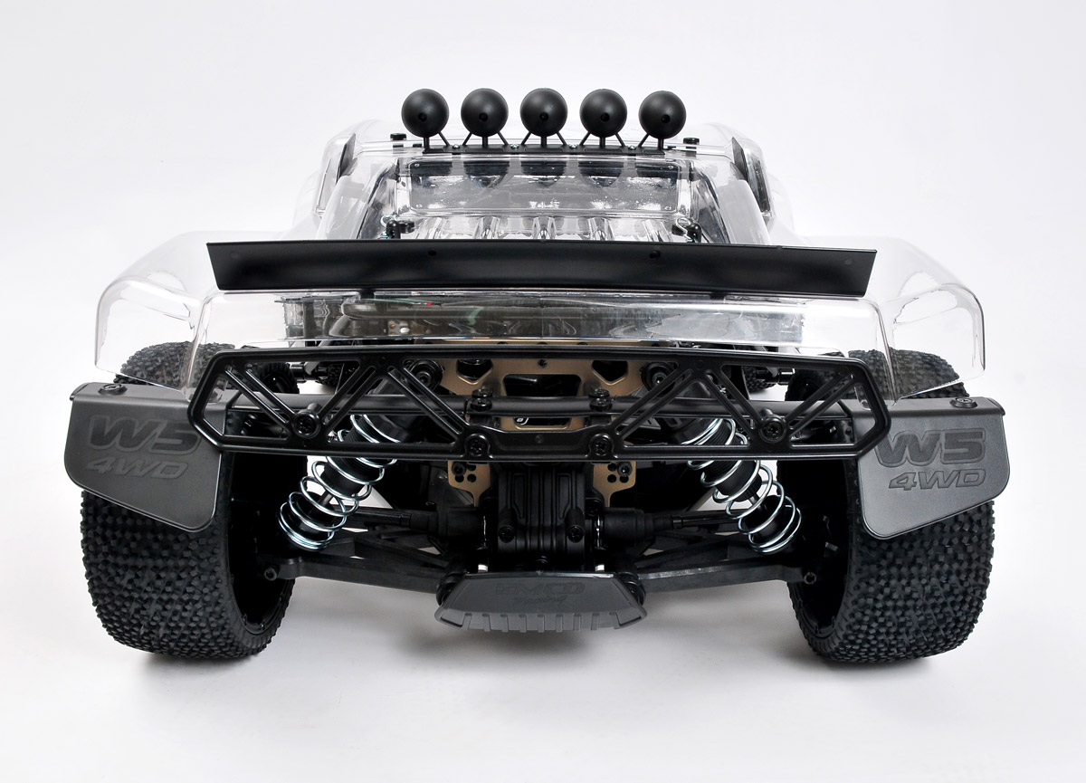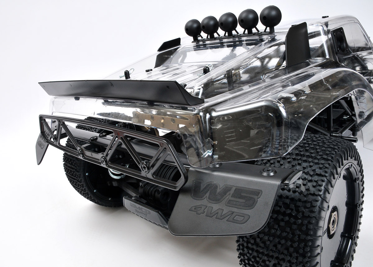 The W5 Body, W5 Decals, FT Spec 7075 alloy anodized shock towers, FT Spec coil-over composite shock absorbers with High Pressurized Cell System, the 190 mm Xross-Max Bite W5 tires, side guards, fully composite body accessories, W5 rear and front bumper and the W5 roll cage.
