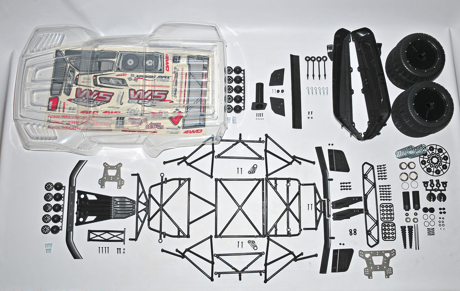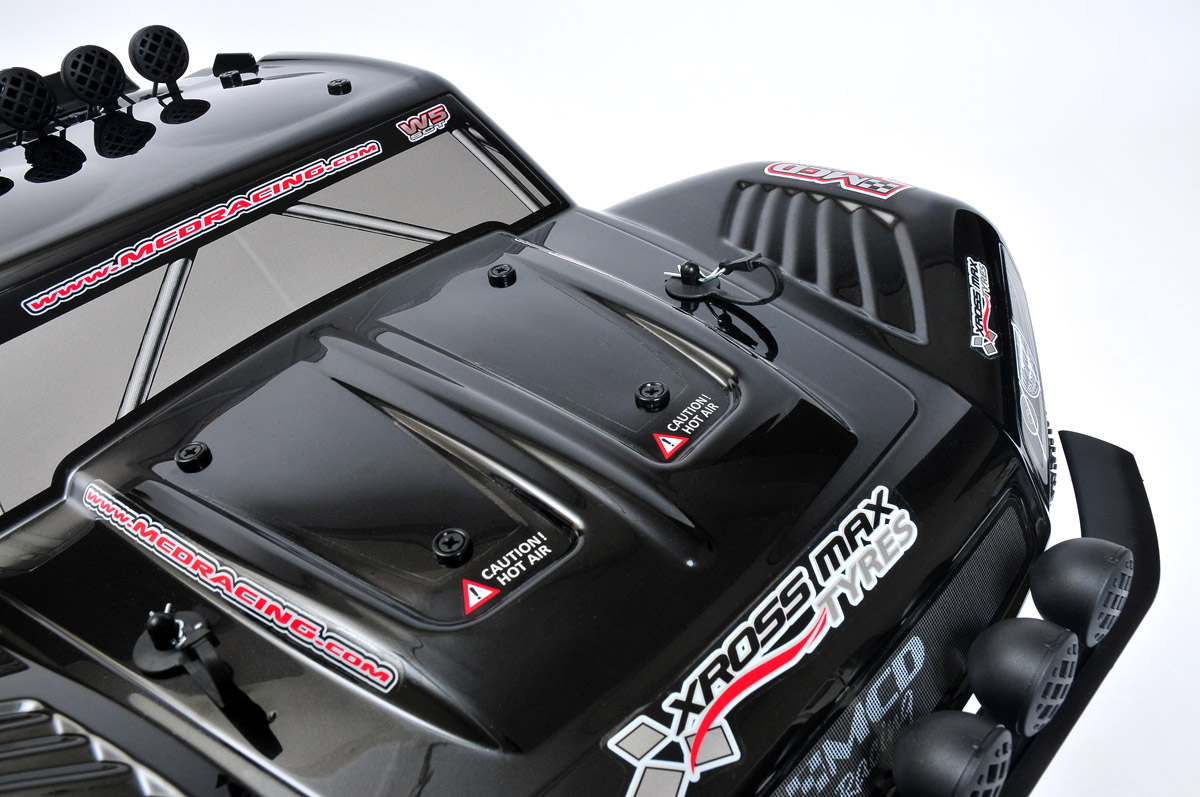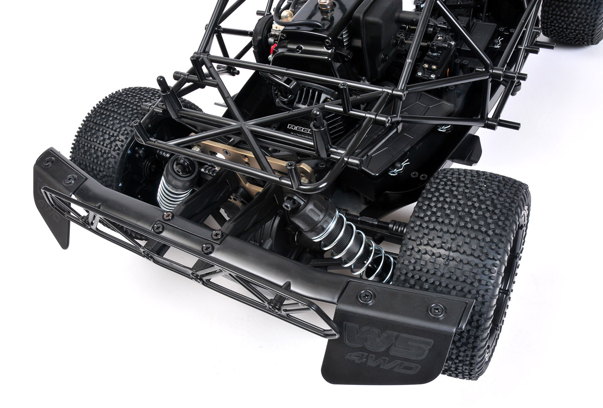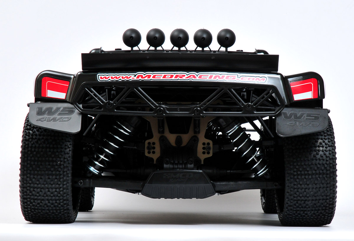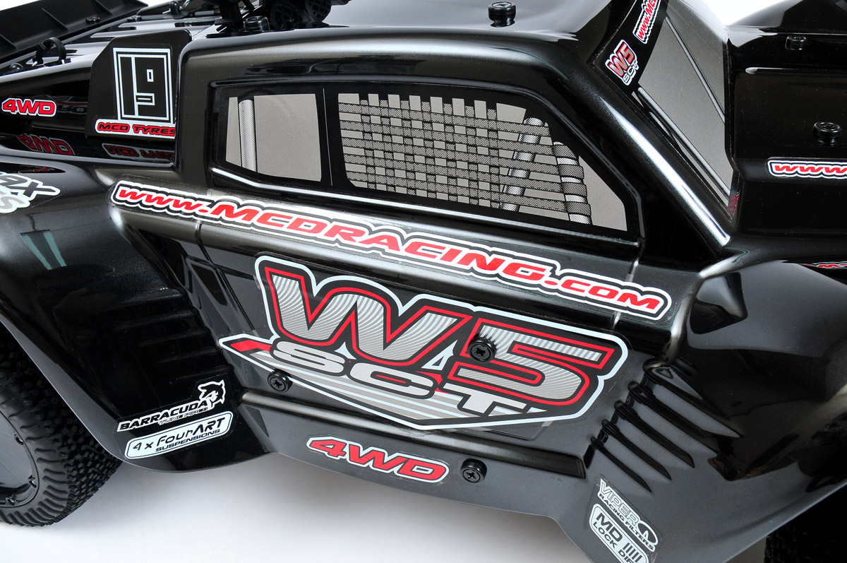 The W5 Body, W5 Decals, FT Spec 7075 alloy anodized shock towers, FT Spec coil-over composite shock absorbers with High Pressurized Cell System, the 190 mm Xross-Max Bite W5 tires, side guards, fully composite body accessories, W5 rear and front bumper and the W5 roll cage.