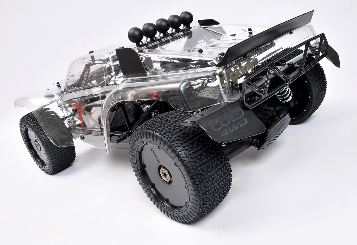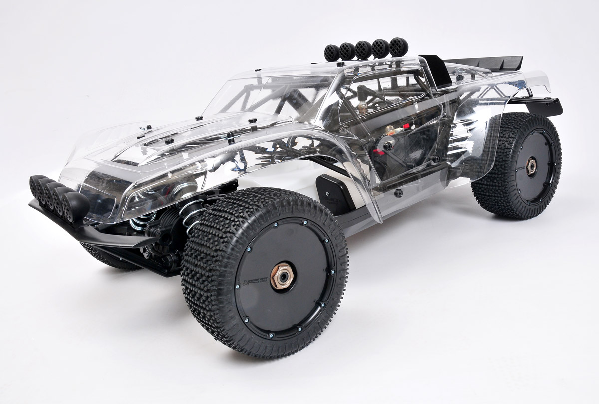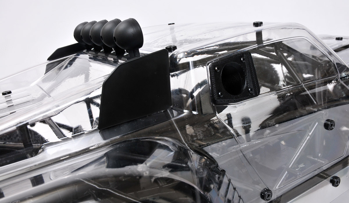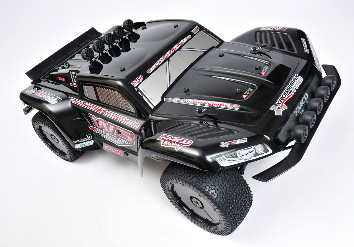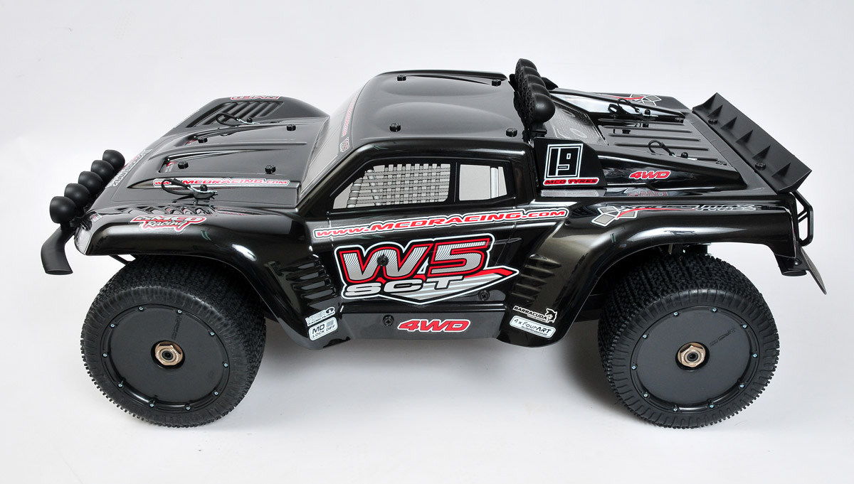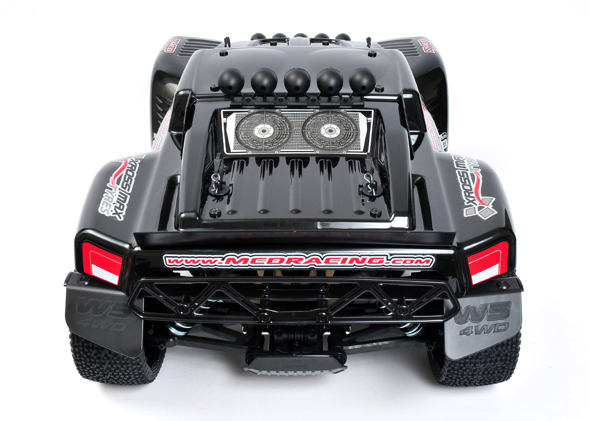 The W5 Body, W5 Decals, FT Spec 7075 alloy anodized shock towers, FT Spec coil-over composite shock absorbers with High Pressurized Cell System, the 190 mm Xross-Max Bite W5 tires, side guards, fully composite body accessories, W5 rear and front bumper and the W5 roll cage.