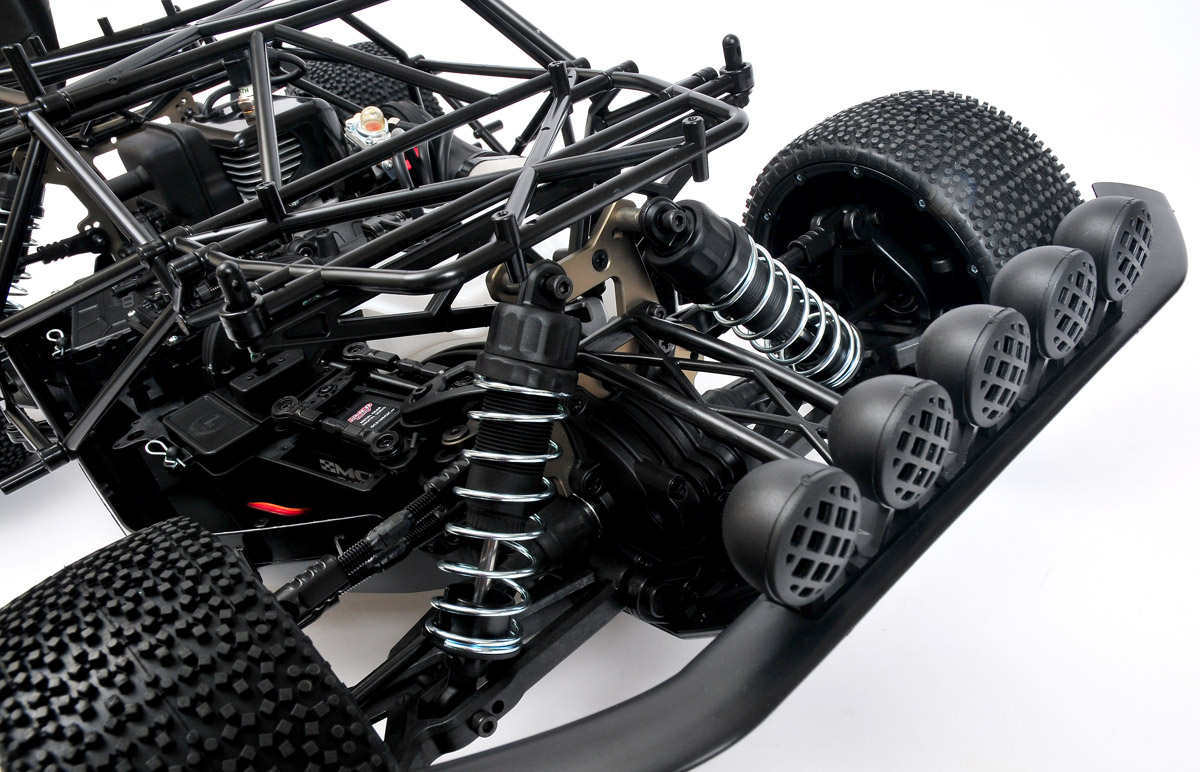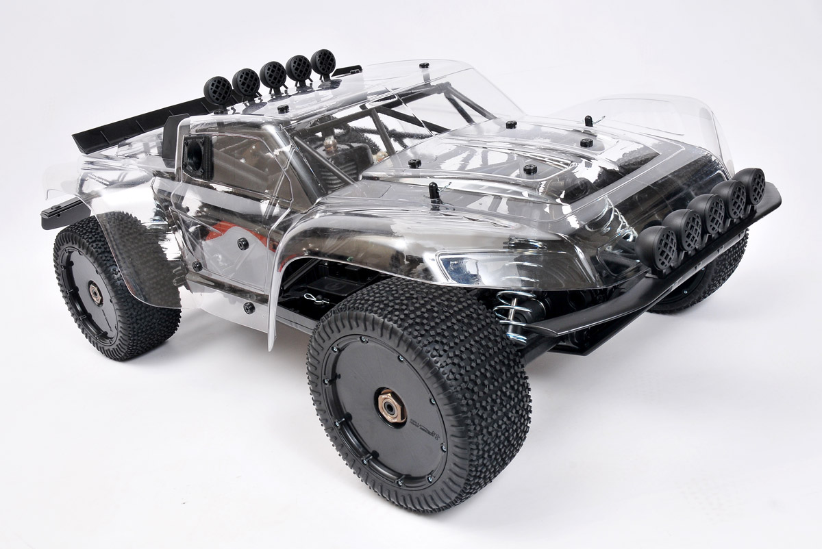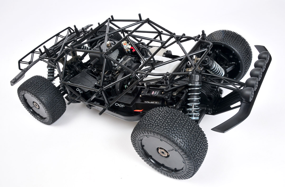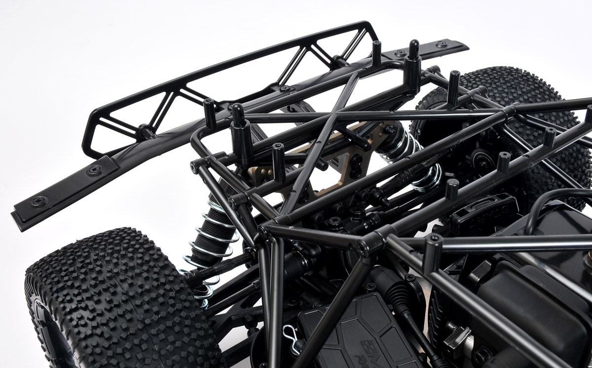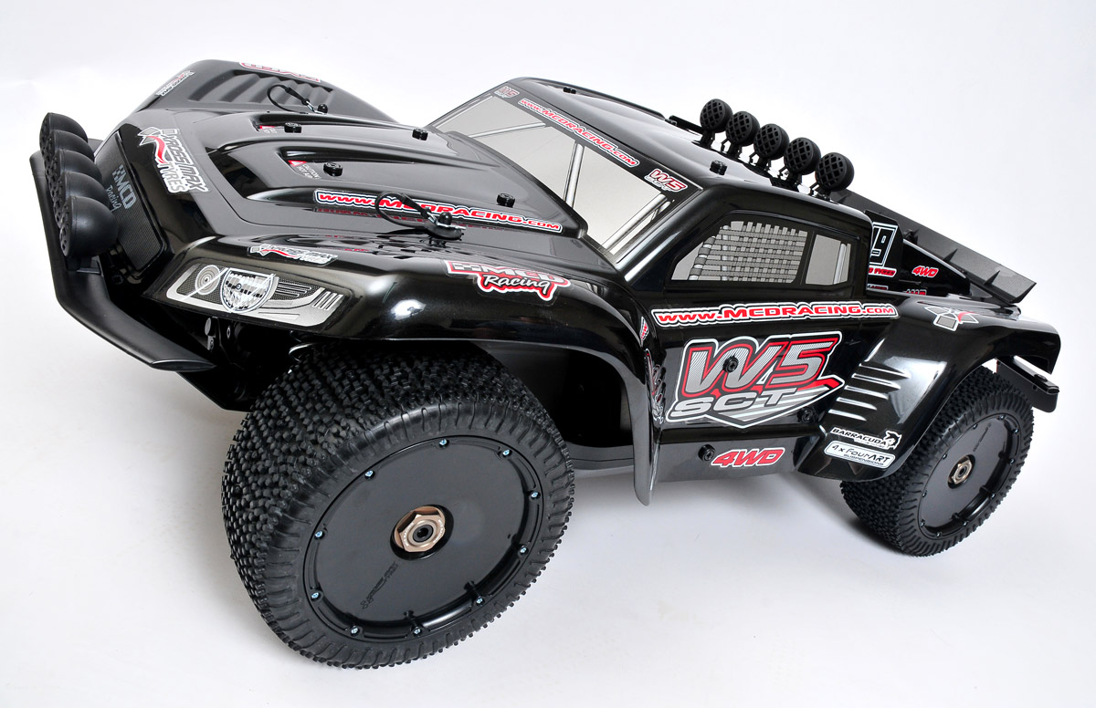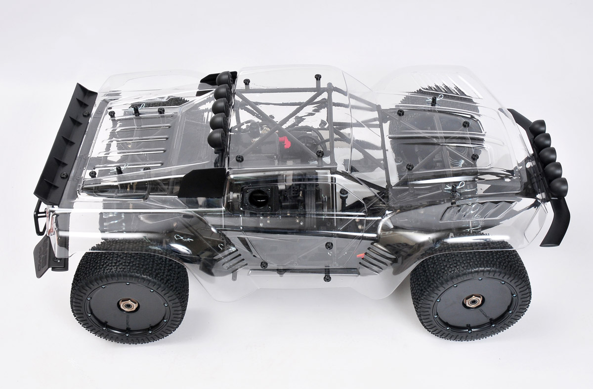 The W5 Body, W5 Decals, FT Spec 7075 alloy anodized shock towers, FT Spec coil-over composite shock absorbers with High Pressurized Cell System, the 190 mm Xross-Max Bite W5 tires, side guards, fully composite body accessories, W5 rear and front bumper and the W5 roll cage.