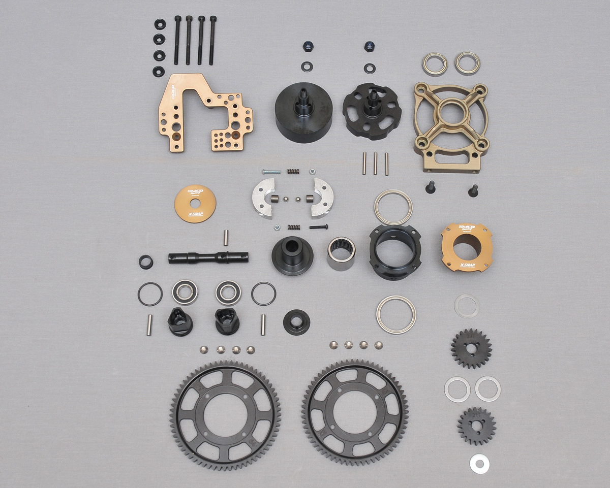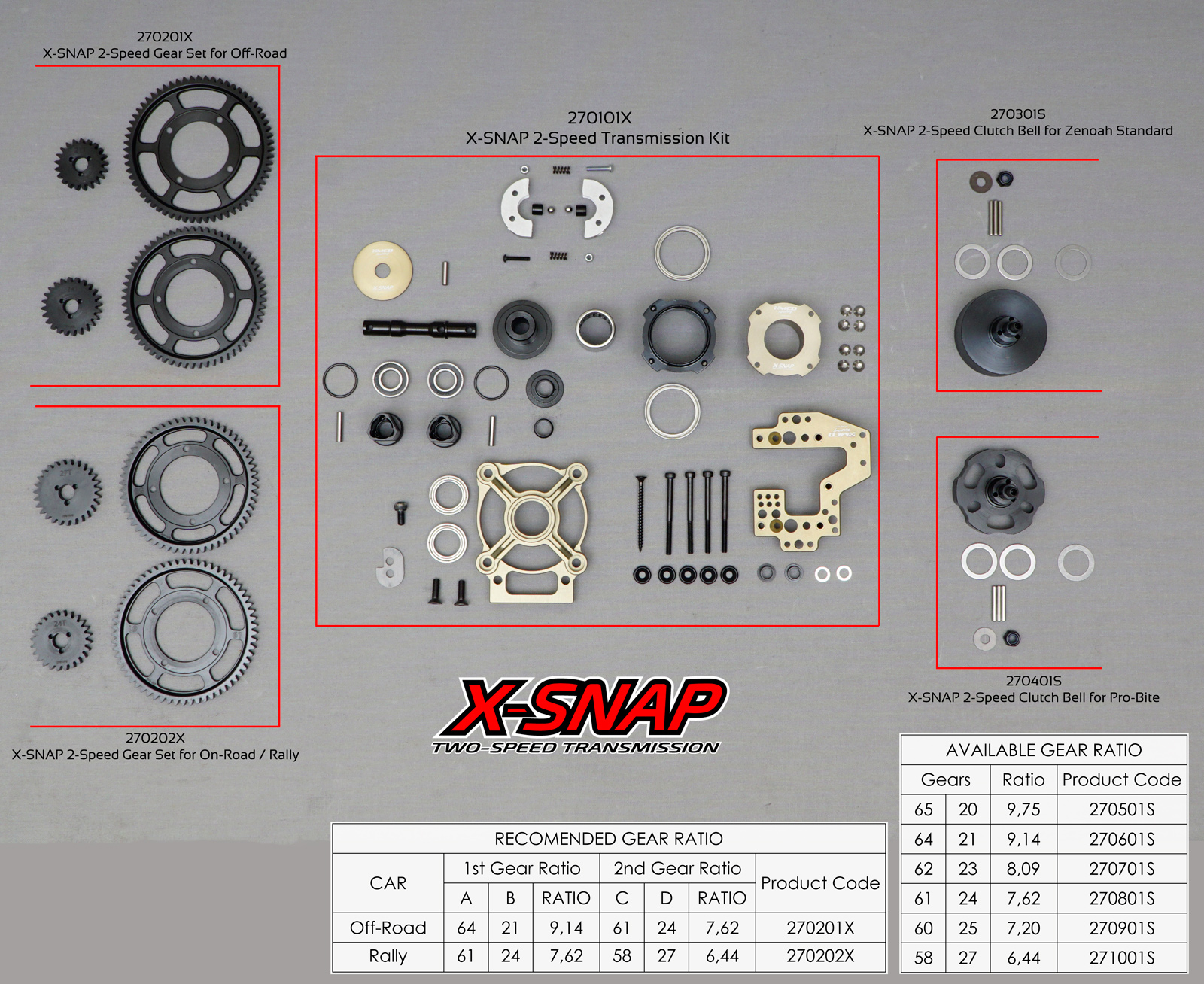 The X-Snap gearbox consists of 3 total order packs. First is the Transmission Kit (the main pack), the second is the gear pack which consists on-road and off-road sets. The third pack is the clutch bell pack where you choose either the standard or the Pro-Bite Clutch bell. To order a full set of gearbox the second and the third packs should be decided accordingly.