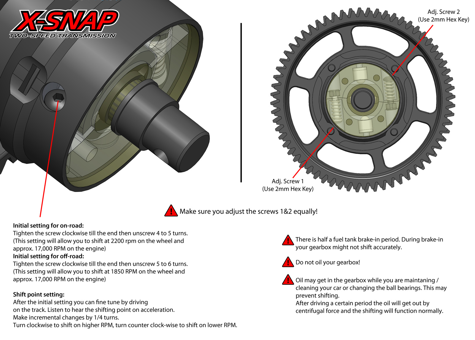 The gear is suitable for our on-road and off-road cars. The correct gear ratio selection must be made in order to use the gearbox. We recommend the ratios for the off-road first gear: 9,14 and for the second gear: 7,62. For the on-road first gear:7,62 and the second gear:6,44.