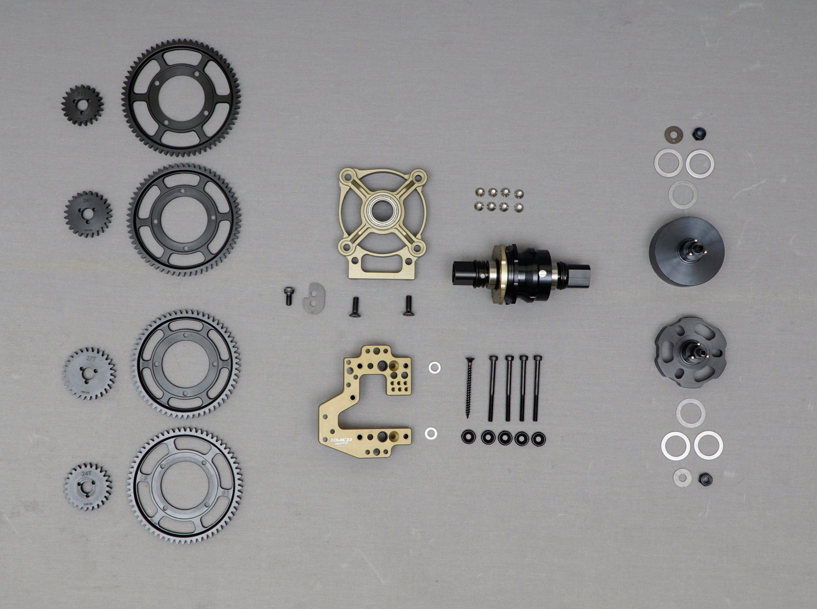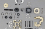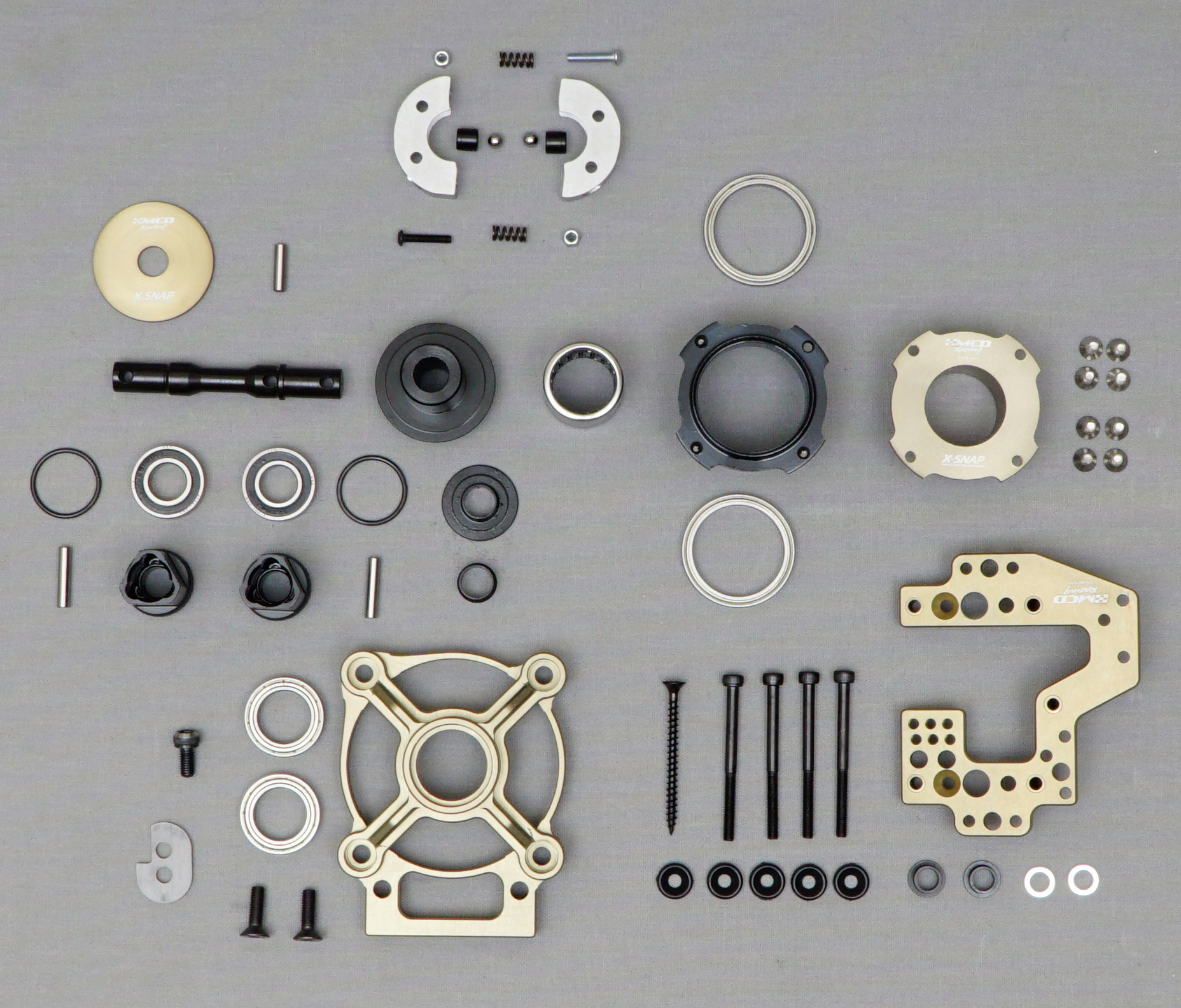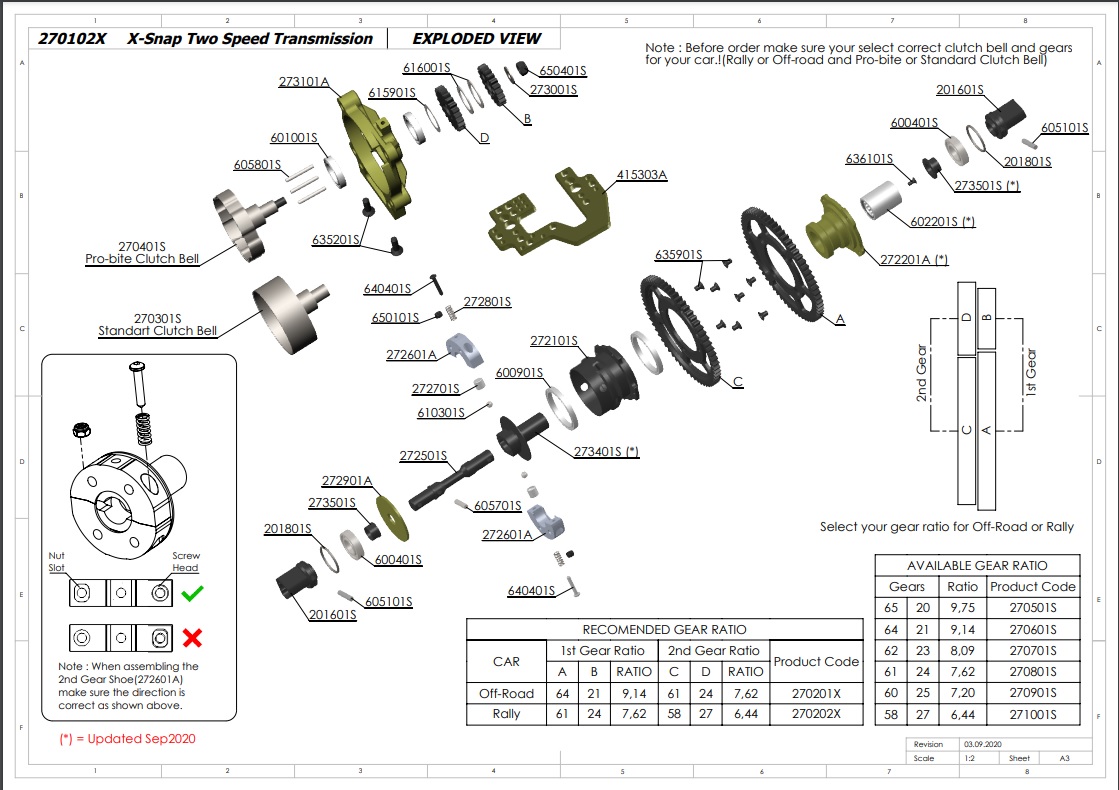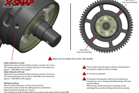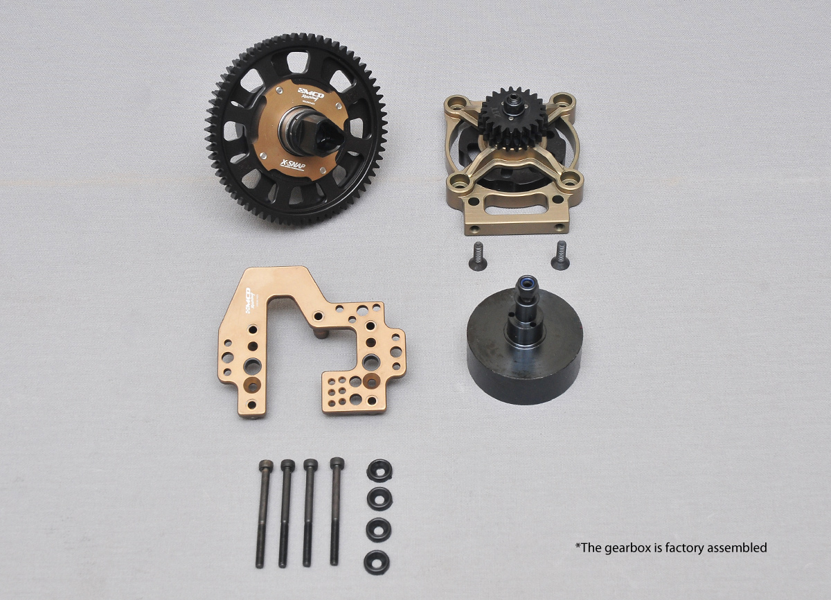 We have updated the two speed transmission X-Snap. The gear is suitable for our on-road and off-road cars. The correct gear ratio selection must be made in order to use the gearbox. We recommend the ratios for the off-road first gear: 9,14 and for the second gear: 7,62. For the on-road first gear:7,62 and the second gear:6,44. The X-Snap gearbox consists of 3 total order packs. First is the Transmission Kit (the main pack), the second is the gear pack which consists on-road and off-road sets. The third pack is the clutch bell pack where you choose either the standard or the Pro-Bite Clutch bell. To order a full set of gearbox the second and the third packs should be decided accordingly.